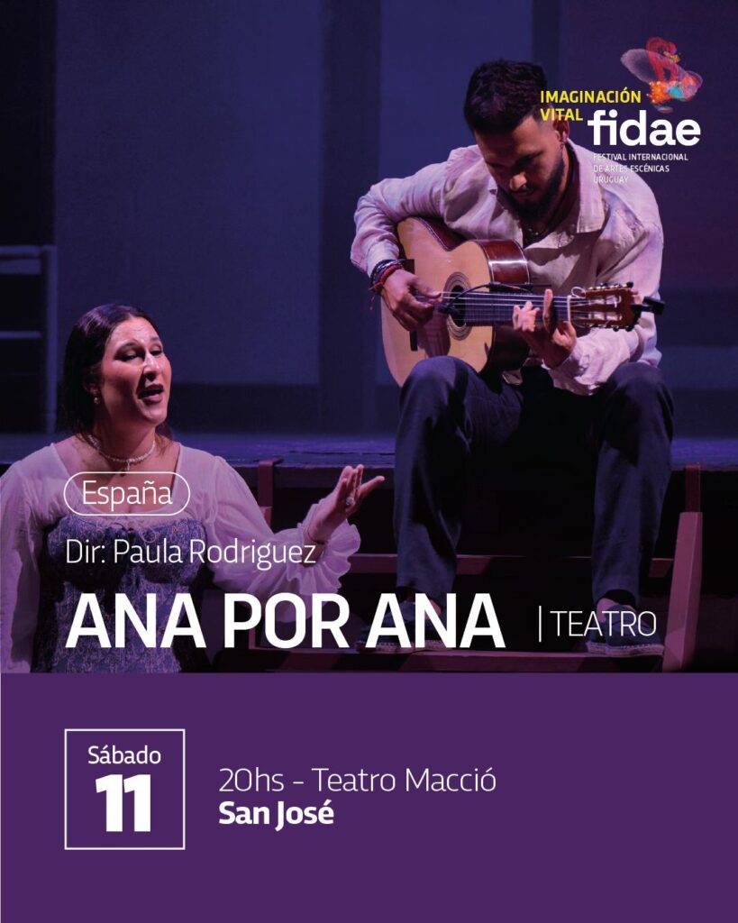 El pasado sábado 11 de octubre el “Festival Internacional de Artes Escénicas del Uruguay”(fidae), presentó en el Teatro Macció , la obra “Ana por Ana” (España), que fue ovacionado por el público. Ana Caro de Mallén y su rebelde y excepcional verso, encarnaron redivivos, en los maravillosos matices de la voz de AnaMar como visceral cantaora, recreadora y contadora de esa historia. Las brillantes guitarra flamenca de su hermano Antonio De Quero, y la dirección y dramaturgia de Paula Rodríguez, completaron este vibrante homenaje a “La Gran Musa de Triana”, del Siglo de Oro español.